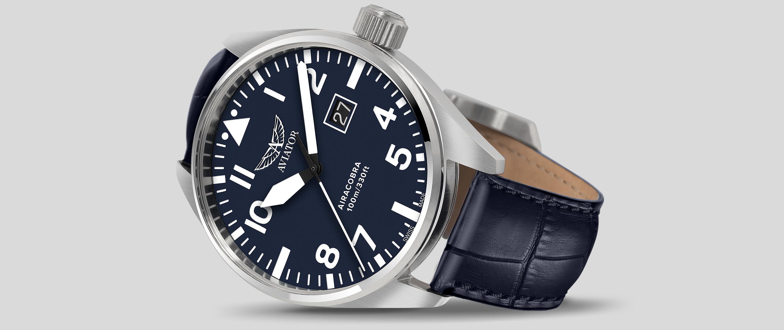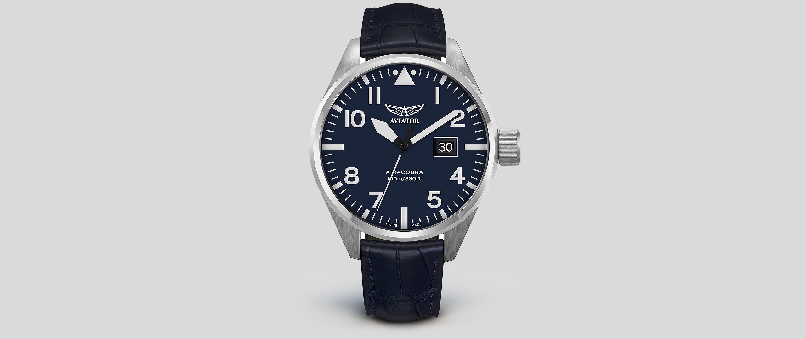 What makes the Airacobra tick with precision? Its deliberately designed, Swiss-made ETA F06.161 Movement. Since each Aviator watch is crafted with a movement to meet a specific form and necessary functionality, the Airacobra’s strikingly large calendar date indicator at 3 o’clock sets it apart with distinction. This innovative calibre is equipped with two superimposed date discs that are driven by an exclusive patented technology and it also offers a power reserve of up to 68 months.