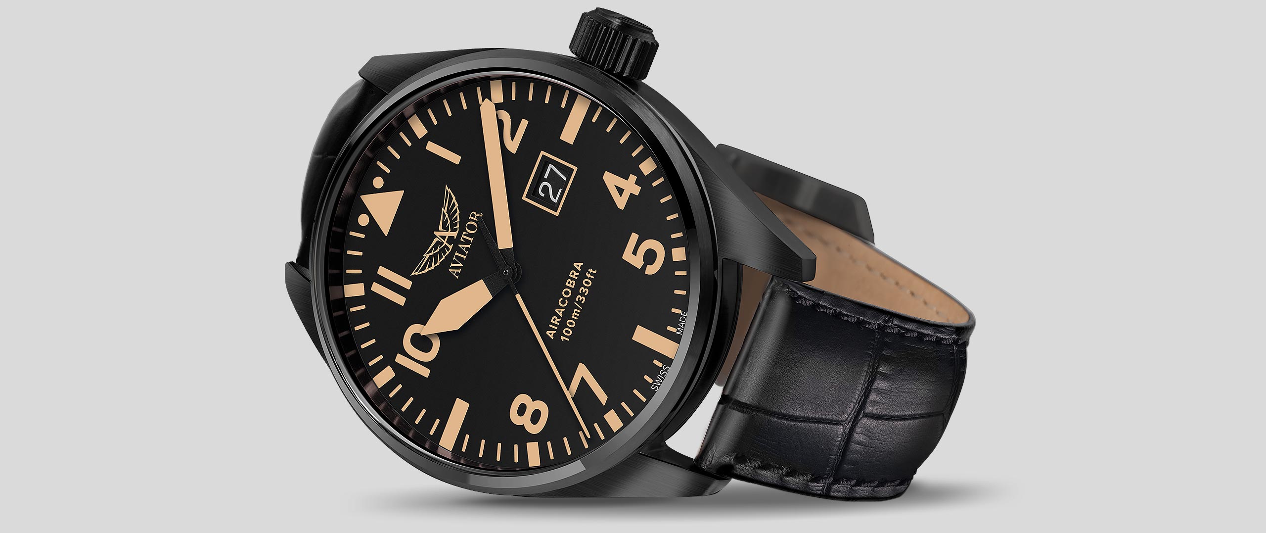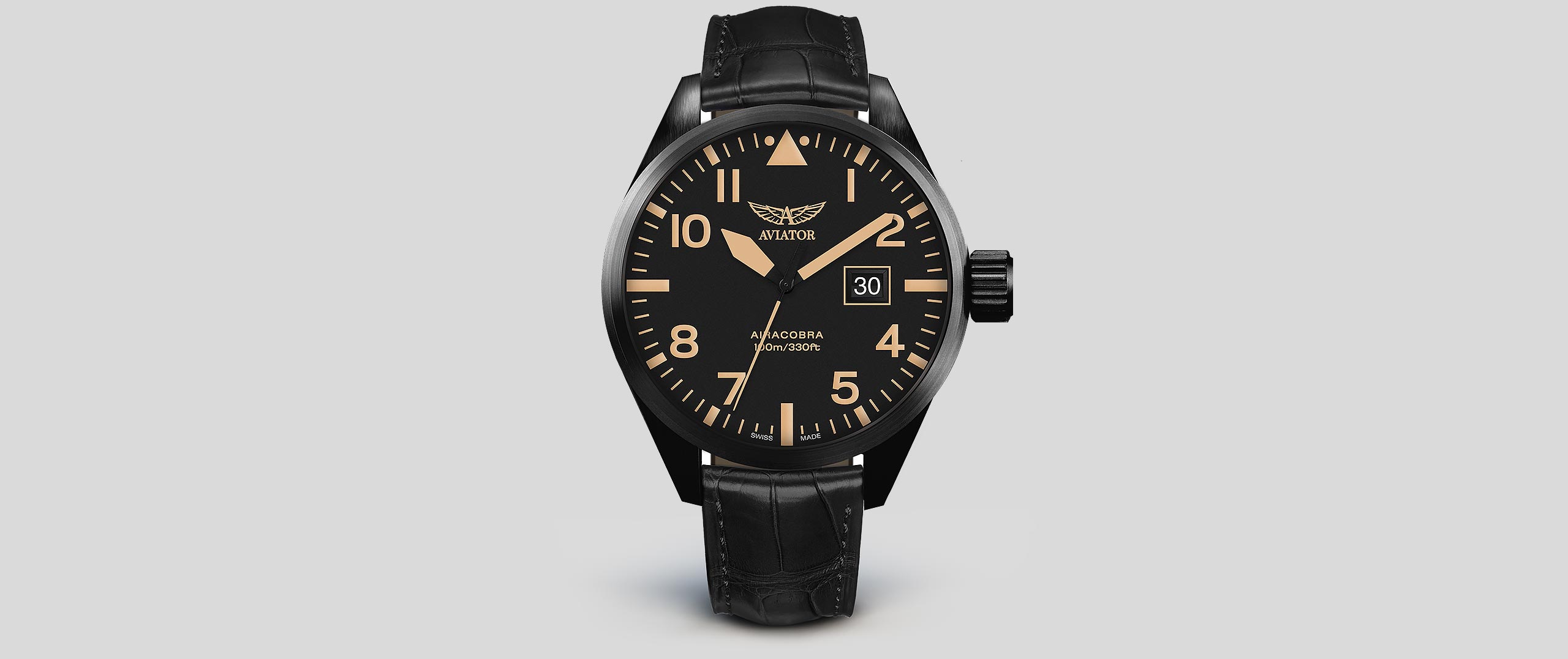 What makes the Airacobra tick with precision? Its deliberately designed, Swiss-made ETA F06.161 Movement. Since each Aviator watch is crafted with a movement to meet a specific form and necessary functionality, the Airacobra’s strikingly large calendar date indicator at 3 o’clock sets it apart with distinction. This innovative calibre is equipped with two superimposed date discs that are driven by an exclusive patented technology and it also offers a power reserve of up to 68 months.