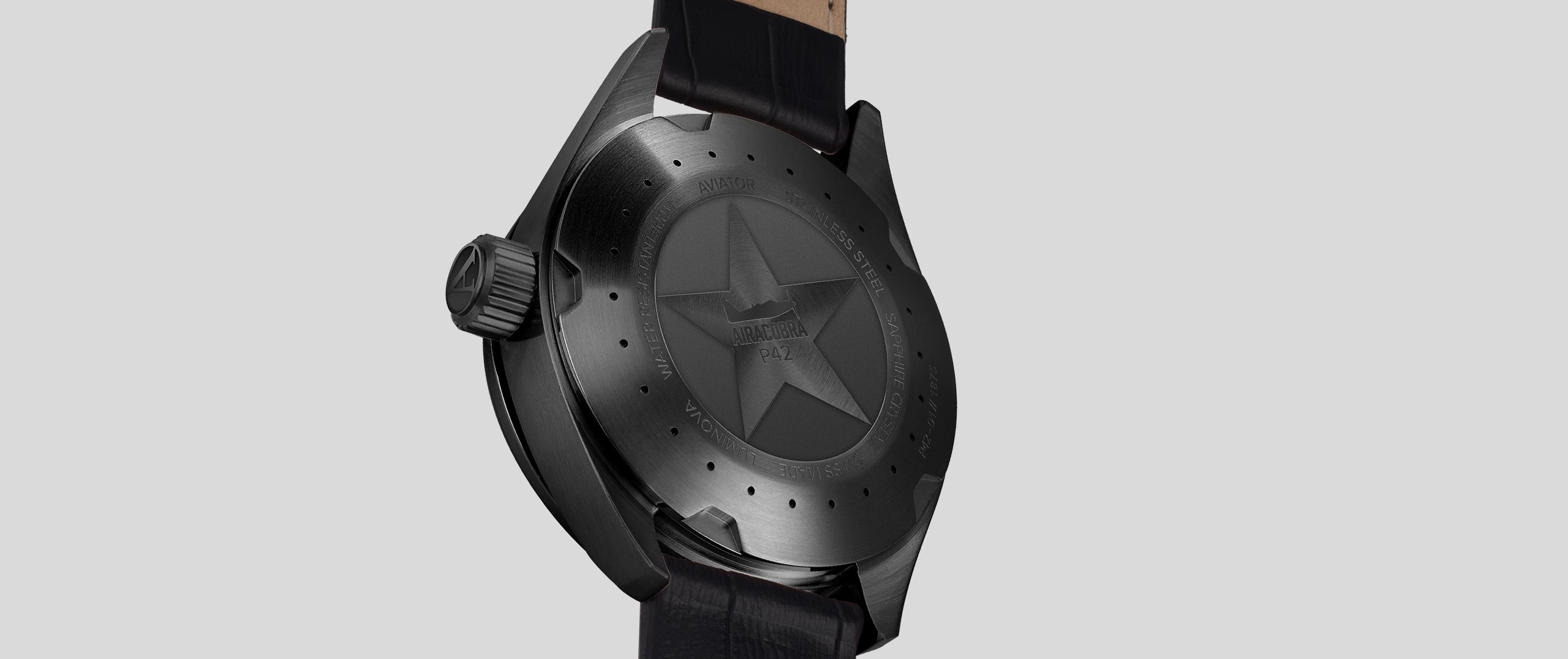 Turn this watch around and the story behind this model reveals its aviation-inspired design. The riveted metal plates and subtle technical descriptions on the case back draw direct design cues from the Airacobra aircraft’s fuselage. An icon of the Airacobra aircraft and the symbolic military star etched into case back further pays homage to this heroic WWII fighter plane. On top of it all, the functionality of the screwed-down case back ensures that it’s perfectly waterproof.