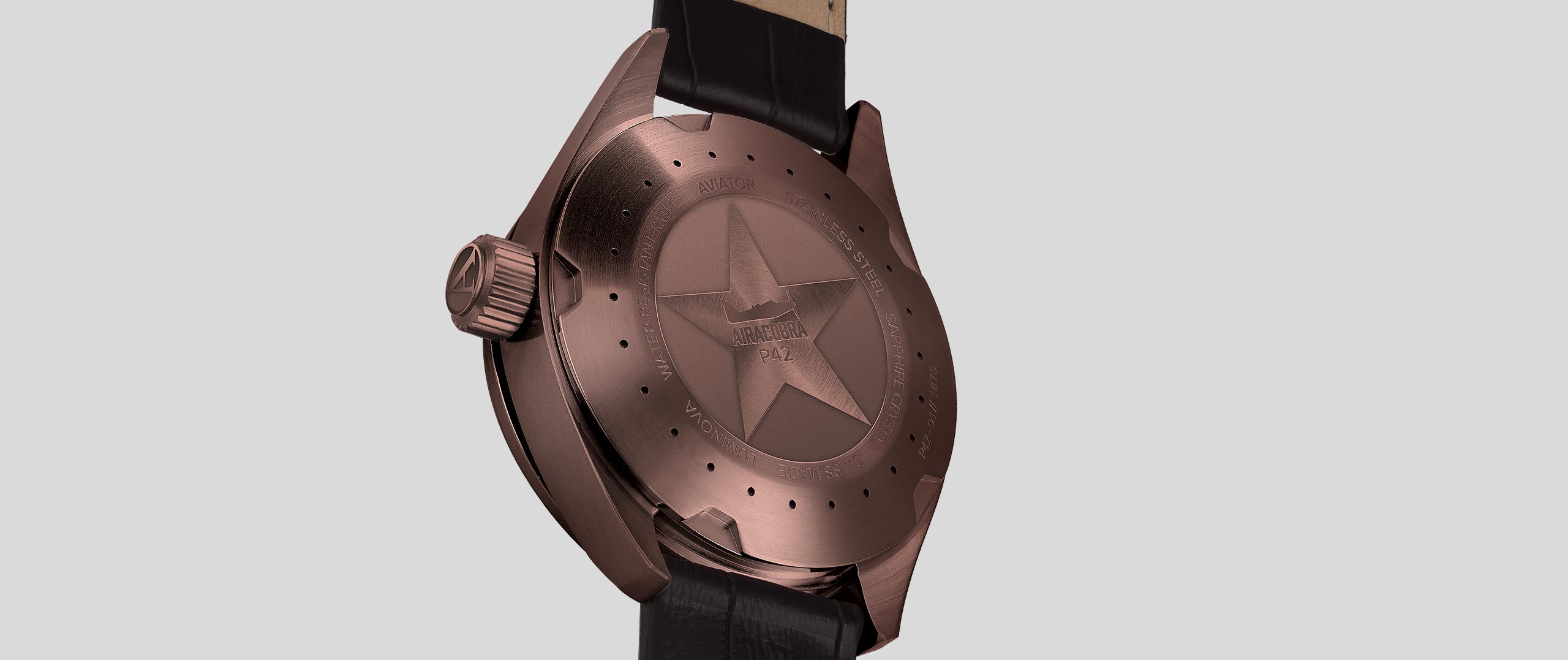 Turn this watch around and the story behind this model reveals its aviation-inspired design. The riveted metal plates and subtle technical descriptions on the case back draw direct design cues from the Airacobra aircraft’s fuselage. An icon of the Airacobra aircraft and the symbolic military star etched into case back further pays homage to this heroic WWII fighter plane. On top of it all, the functionality of the screwed-down case back ensures that it’s perfectly waterproof.
