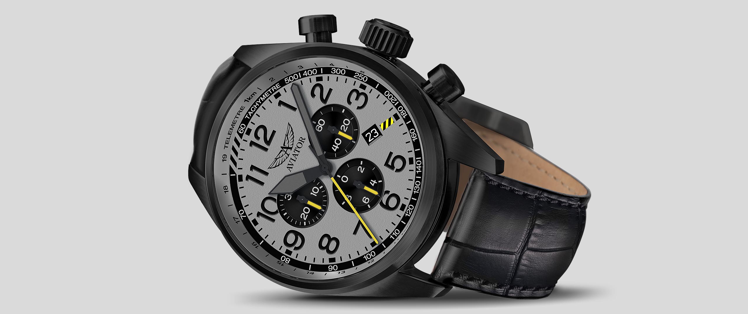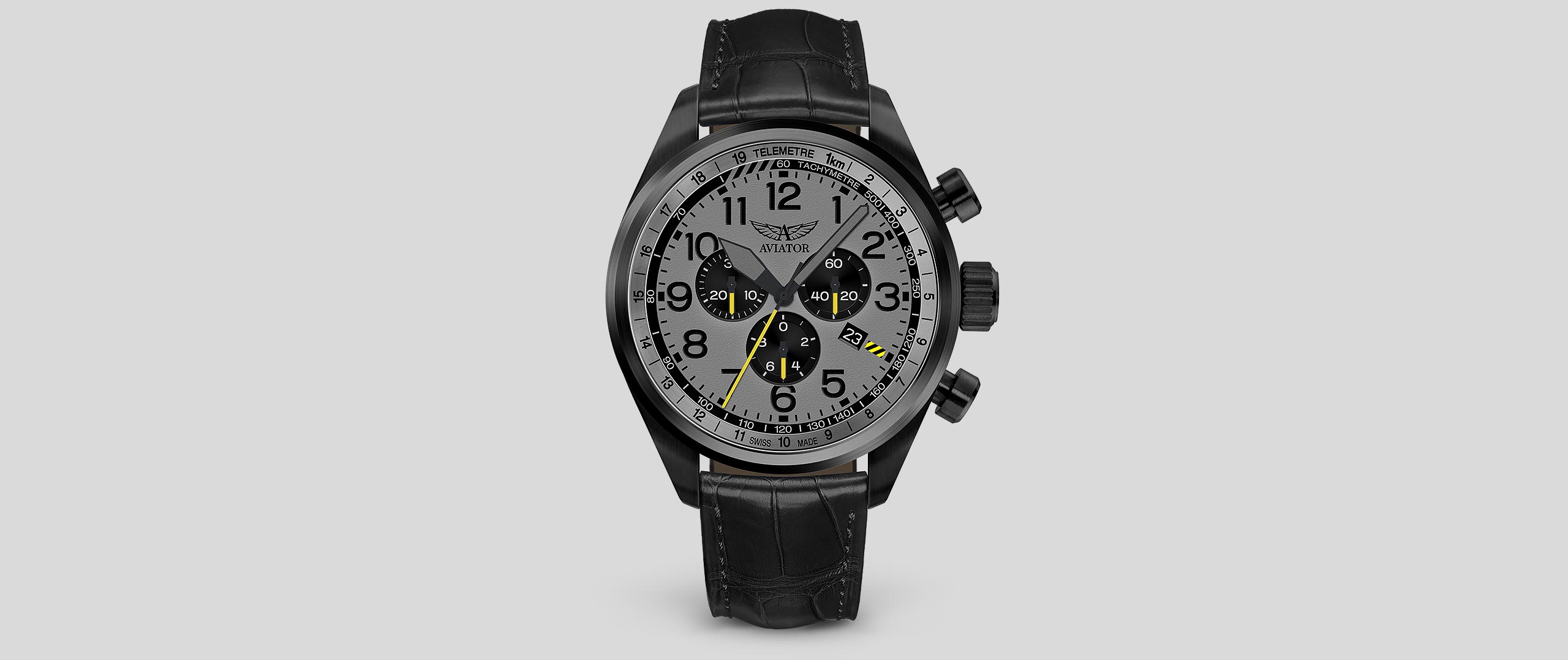 The success of infantry operations during WWII were made possible with the Airacobra supporting troops from the sky. Just as this fighter aircraft was instrumental to both pilots and the mission, the Airacobra P45 Chrono watch offers the same trusted reliability with a tool-like look, inspired by this honorable war hero. Crafted with premium materials, the Airacobra P45 Chrono watch blends military precision with a classic look. Its high-contrast hands and numerals are indicative of the classic cockpit that are matched with a timeless casing and luxurious alligator-style strap. It is the alliance of steadfast reliability and a passion for commemorating aviation history that’s encapsulated in every Aviator watch.