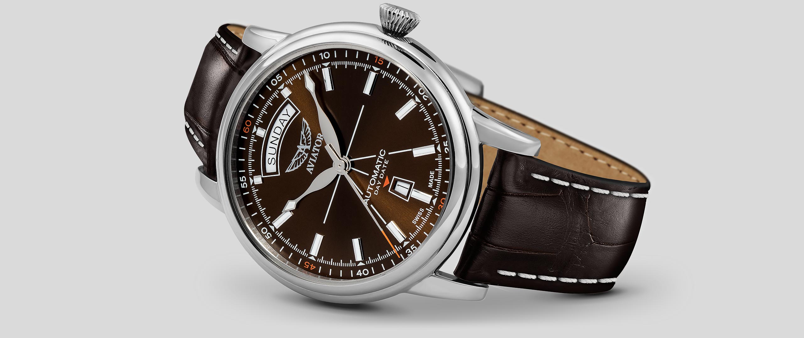 Crafted from the most premium materials, every Aviator strap is individually developed to share the spirit of the collection. The luxurious, alligator-style leather strap of this timepiece has undergone an extensive tanning process to enhance suppleness and pairs an elegant contrast stitching for added sophistication. It features an easy locking system of the deployment buckle that fastens the strap with one click. To adjust, simply move the buckle forward or backward on the strap.