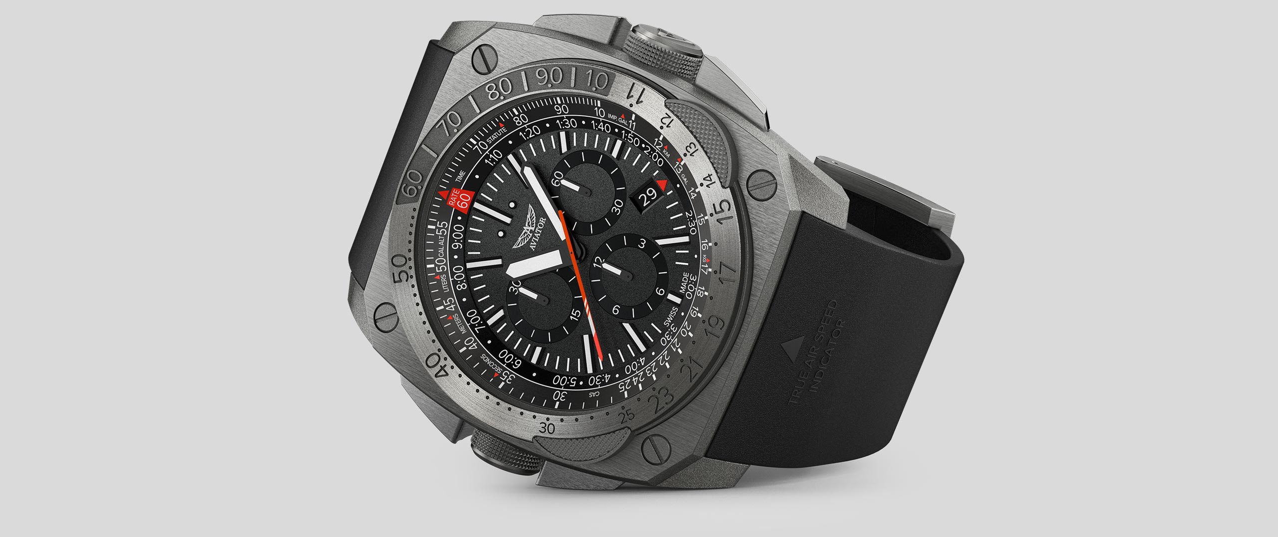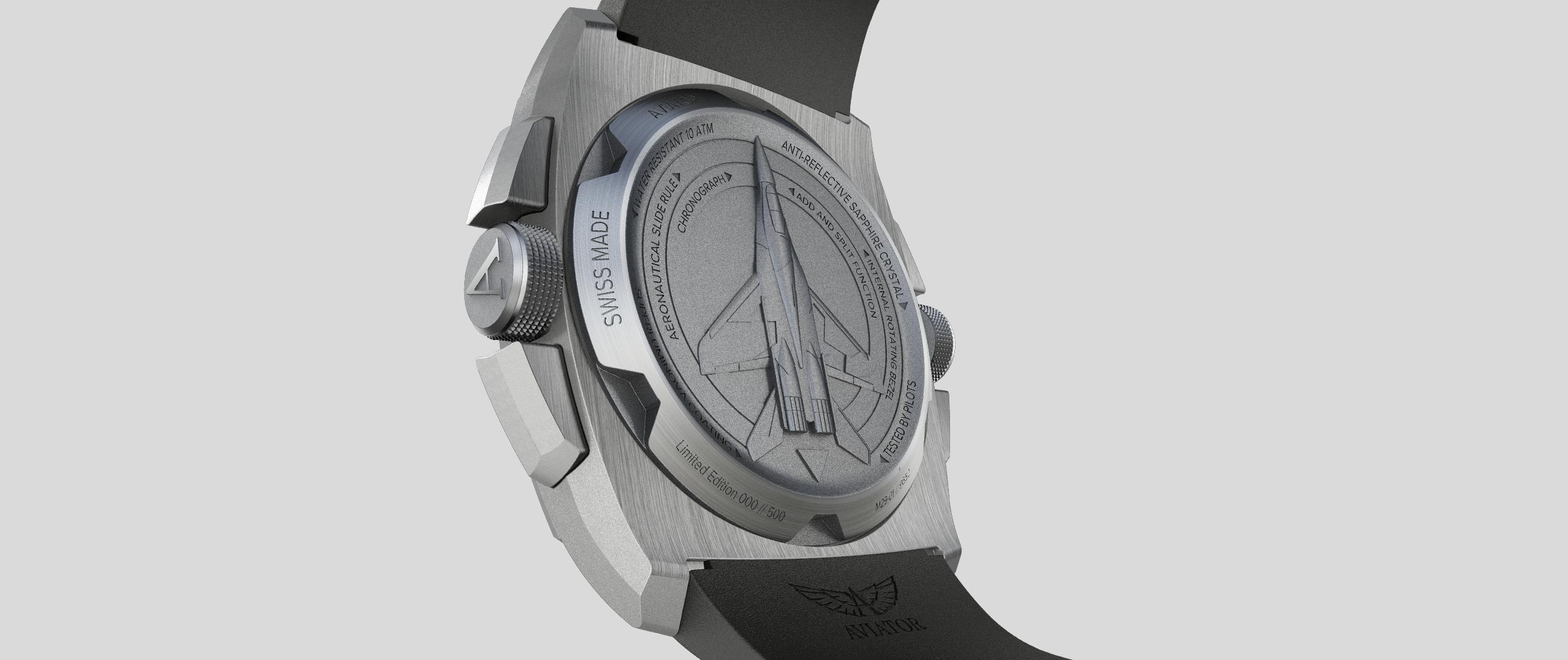 Inspired by the MiG-29’s dashboard instrument, featuring multi-functionality and multi-finishings, the dial lets you keep your eye on three levels of information: the aeronautical slide rule on the rotating reflector, the time and stopwatch with its three chronograph eyes, and the central stop second. Its clean indexes and bold hands offer easy readability, while the slide rule lines and the chronograph counter circles lend a hi-tech feel. Since every Aviator dial is the result of highly precise engineering and manufacturing skills, you get a high-level of quality that’s unlike any other.