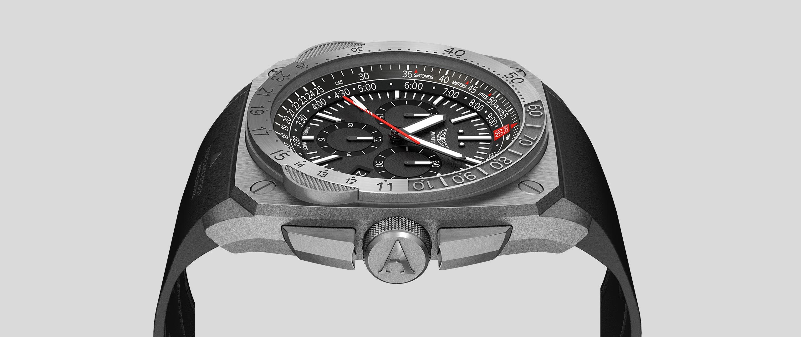 The case is comprised of the bezel, body case and back case. With over dozens of elements assembled with the finest watchmaking techniques, the sophisticated geometric design draws inspiration from the aerodynamics of the fuselage and the MiG-29 cockpit clock. It is the iconic dashboard screw on the perimeter that gives this watch the rugged, instrumental feel while its intricate, multi-finished case components are outfitted in a hi-tech look. Well integrated into the watch’s design, the chronograph pushers and identical crown protectors on opposite sides of the case incorporate the sleek curves of the MiG-29 jet.
