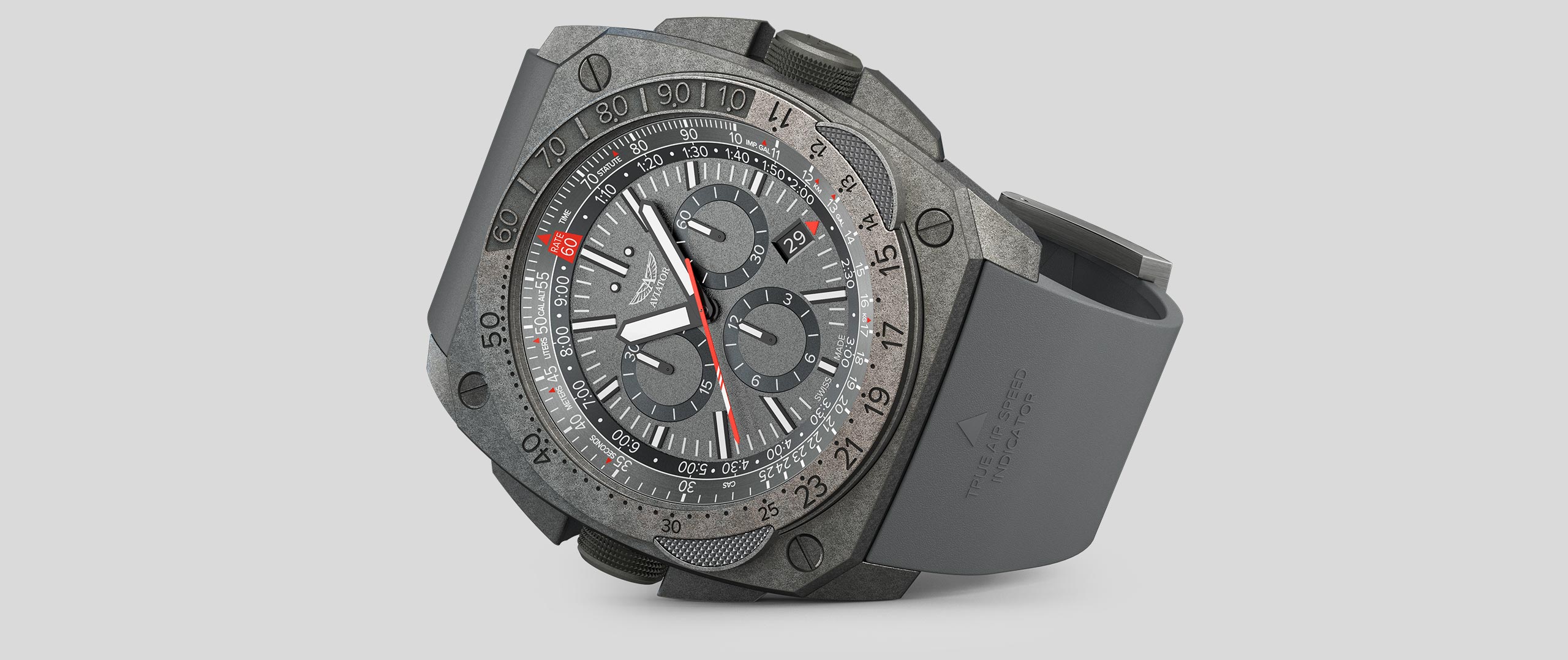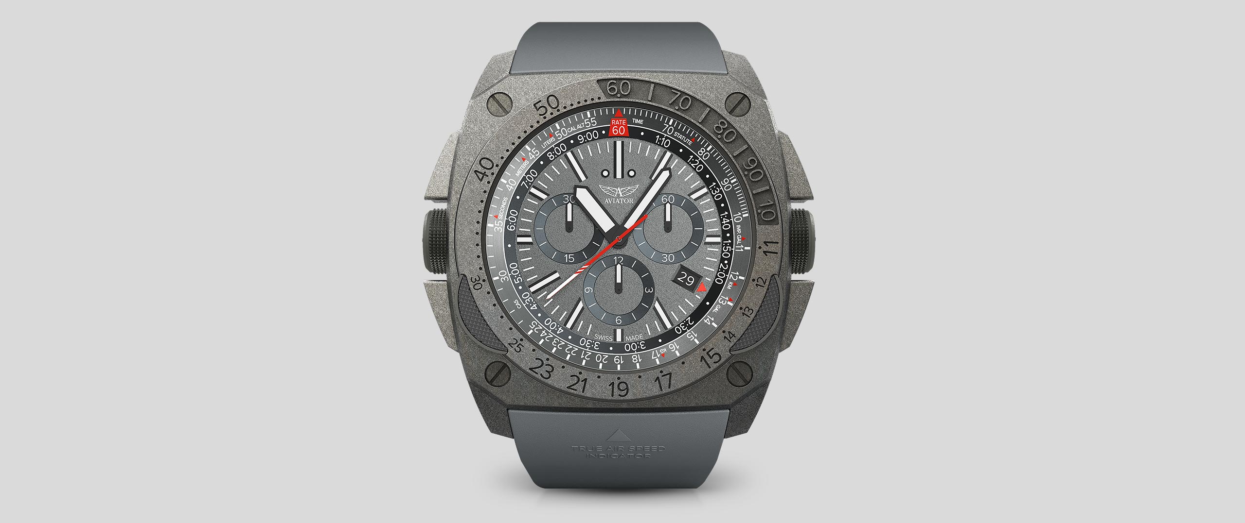 Inspired by the MiG-29’s dashboard instrument, featuring multi-functionality and multi-finishings, the dial lets you keep your eye on three levels of information: the aeronautical slide rule on the rotating reflector, the time and stopwatch with its three chronograph eyes, and the central stop second. Its clean indexes and bold hands offer easy readability, while the slide rule lines and the chronograph counter circles lend a hi-tech feel. Since every Aviator dial is the result of highly precise engineering and manufacturing skills, you get a high-level of quality that’s unlike any other.
