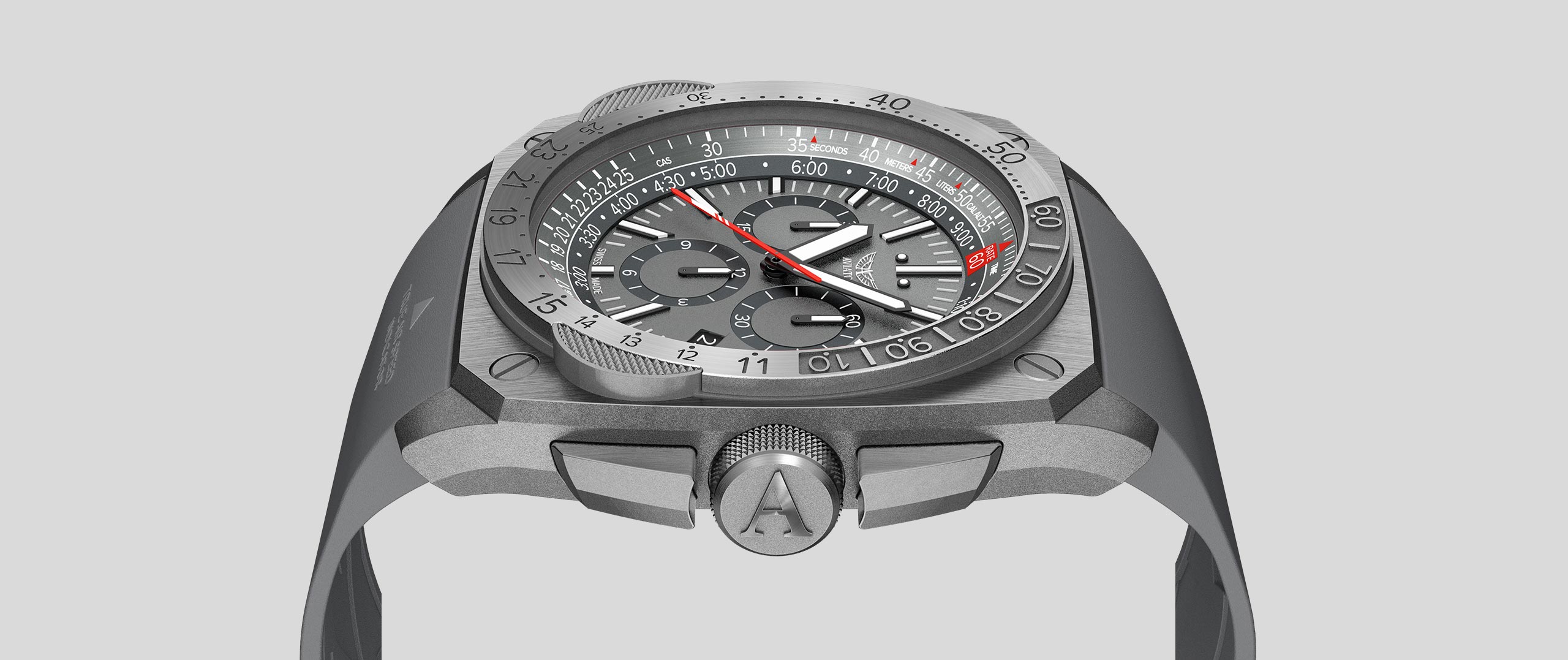 The case is comprised of the bezel, body case and back case. With over dozens of elements assembled with the finest watchmaking techniques, the sophisticated geometric design draws inspiration from the aerodynamics of the fuselage and the MiG-29 cockpit clock. It is the iconic dashboard screw on the perimeter that gives this watch the rugged, instrumental feel while its intricate, multi-finished case components are outfitted in a hi-tech look. Well integrated into the watch’s design, the chronograph pushers and identical crown protectors on opposite sides of the case incorporate the sleek curves of the MiG-29 jet.