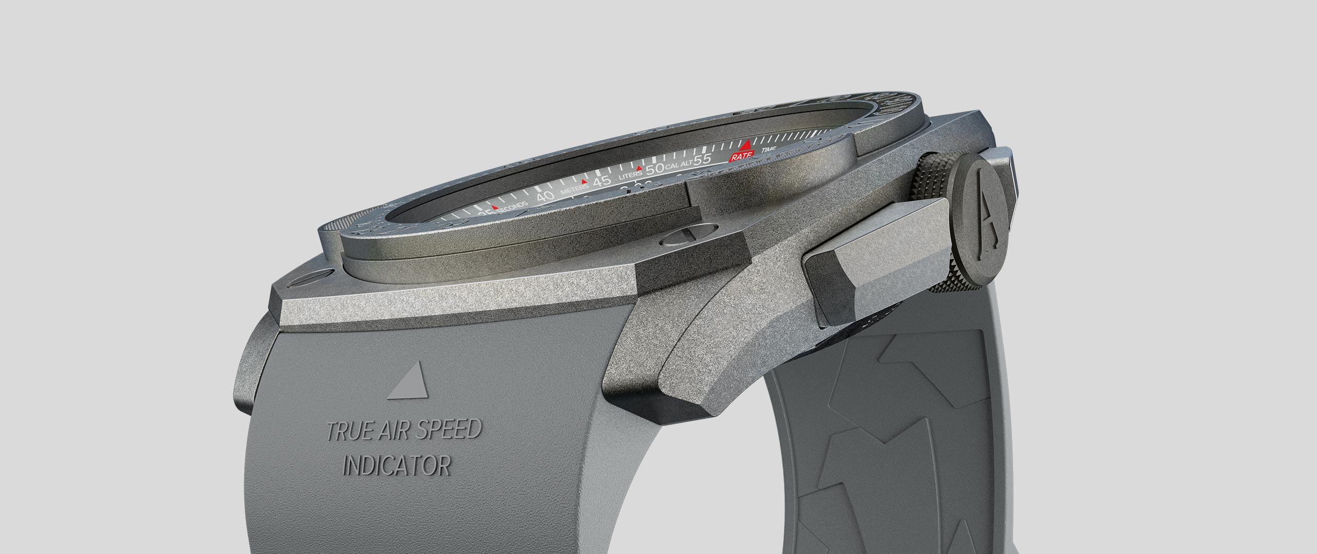 Made from premium materials and high-grade rubber that’s well-designed for an ergonomic fit, every Aviator strap is deliberately developed to meet the highest standard of both design and engineering. The rugged rubber strap features the True Air Speed® inscription, describing the slide rule functionality while paying homage to E6B flight computers, and together lending to this watch’s instrumental look. On the back side, the aeronautical triangular camouflage pattern not only reflects the MiG-29 fuselage, but it is also designed with an airflow pattern to protect the wrist from perspiring in hot and humid weather.